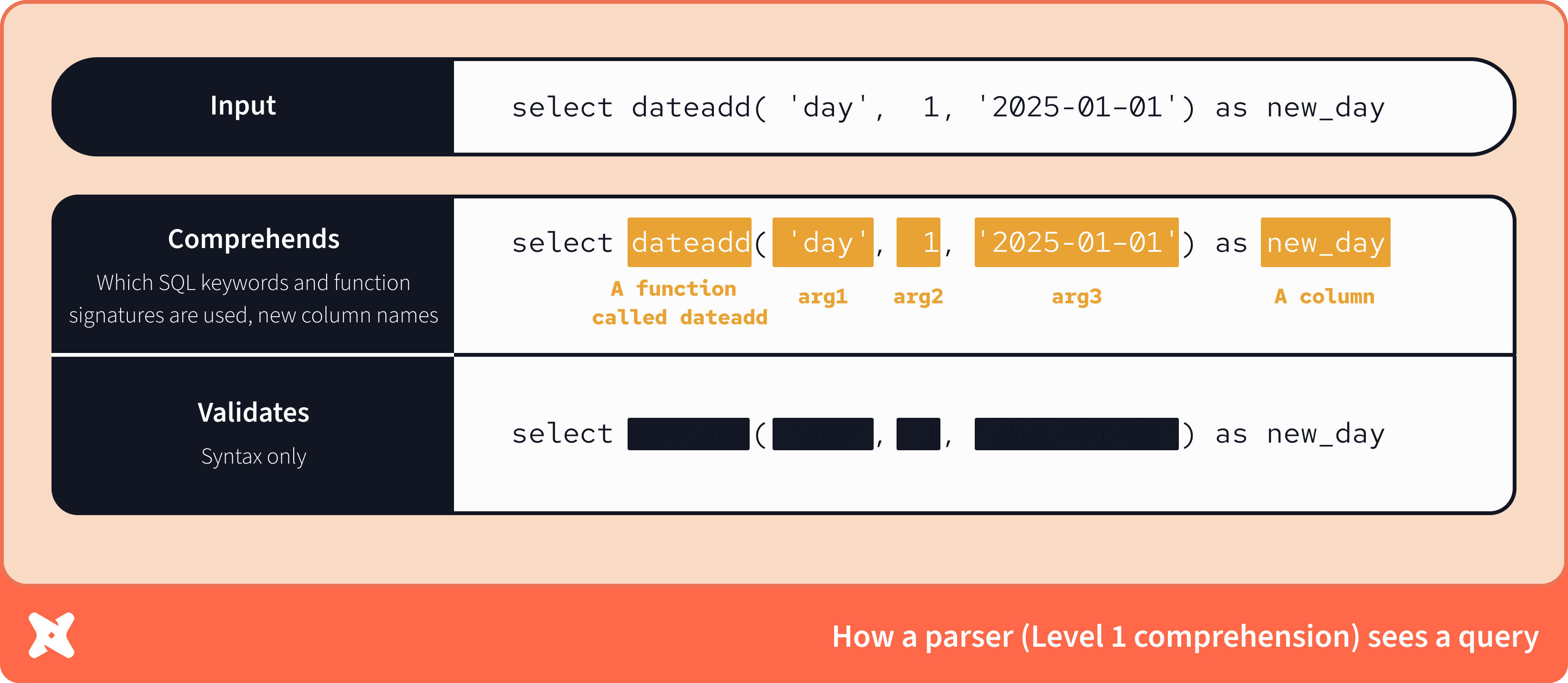 A better question is “to what level can you comprehend SQL?” To that end, we have identified different levels of capability. Each level deals with a key artifact (or more precisely - a specific "intermediate representation"). And in doing so, each level unlocks specific capabilities and more in-depth validation.